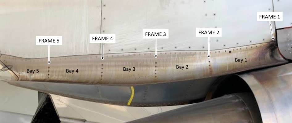 | 背景 | 1、12位运营人报告称,737MAX发动机后吊架下部隔热罩消音蒙皮(件号313A6810-4)出现了变形和裂缝损坏。隔热罩结构对于保护后整流罩免受发动机排气极端高温的影响至关重要。另外,有两份报告指出,隔热罩消音蒙皮出现了变形损坏,但没有裂缝。 2、在隔热罩消音蒙皮上发现了31起裂纹损伤报告。事件及其相应的飞行小时数和飞行周期列于附表中。所有事件的平均飞行小时和循环次数分别为11105和4055。 3、737 MAX的热屏蔽(P/N 313A6800)与737NG的设计不同。737 MAX的热屏蔽由桁条、五块框、隔热毯和三块外部蒙皮组成。在plume suppressor下蒙皮(P/N 313A6810-4)上发现了裂纹损坏的报告,该蒙皮由0.080英寸厚的超塑成型(SPF)钛板制成。 报告中有27例表明,裂纹损坏沿后整流罩隔热罩消音蒙皮(P/N 313A6800)3和4号框之间的plume suppressor下蒙皮宽度分布。还有3例表明,在后整流罩热屏蔽4和5号框之间,裂纹损坏也沿plume suppressor下蒙皮的宽度分布。此外,还有一例报告表明,在2号框的新位置处发现了裂纹痕迹。(框编号见下附图) |