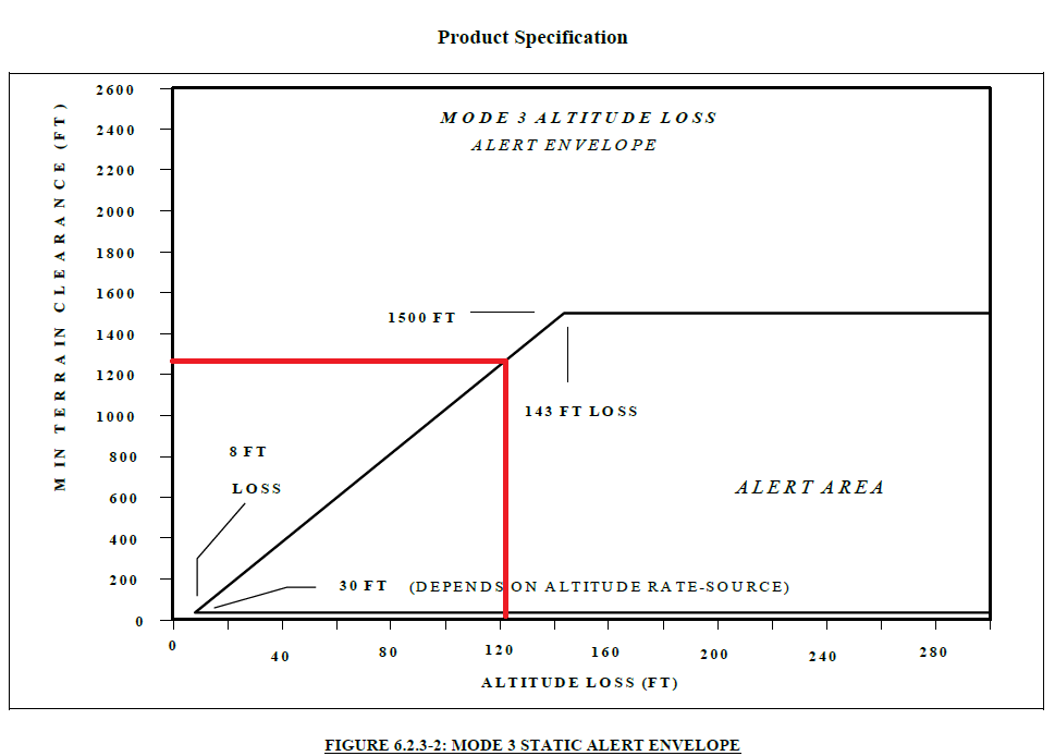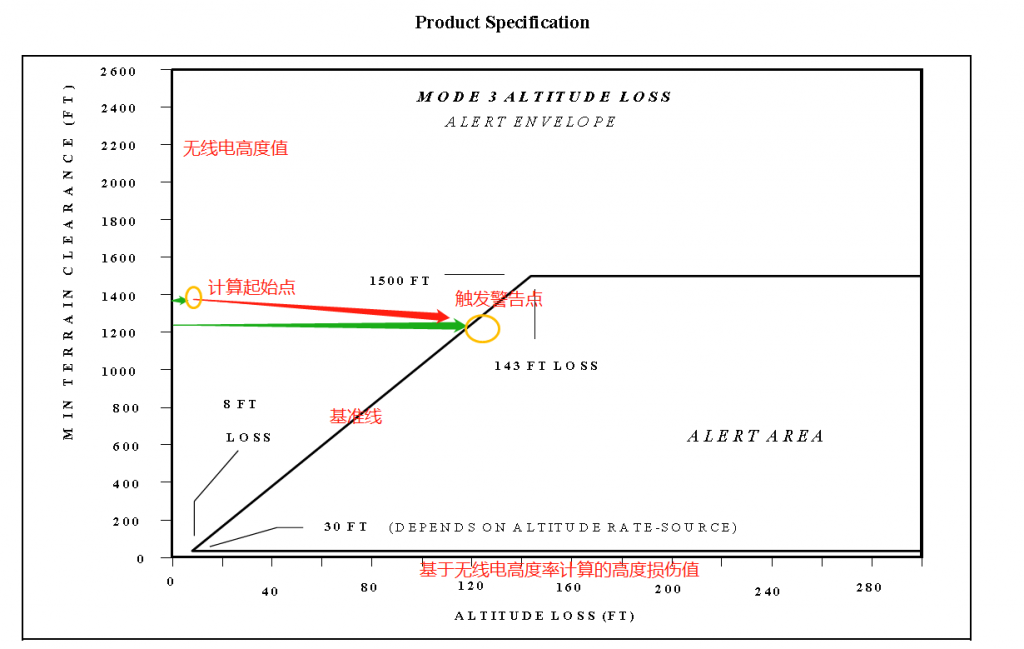 这个图是这样看,横轴是无线电高度,纵轴是掉的高度。掉高度是从高度率开始变负值计入初始值。以后的高度比这个高度低的差值就是altitude loss。也就是1387-1261=126,高于的该值。由于计算机只能记录触发前20秒的值,实际可能比这个更高。