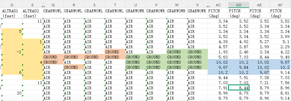 译码数据如下所示,通常监控的触发条件是飞机从前轮离地到主轮离地显示空信号0.5秒(含)以内的俯仰角最大值。B737起飞可能擦尾仰角: 800 /11.0°