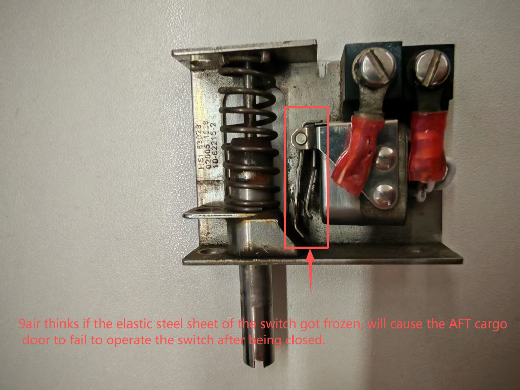 9air推测,可能是开关的弹性钢板冻结了(请参阅附件),或者冰冻结了开关的其他部分,导致AFT货舱门在关闭后无法操作开关。