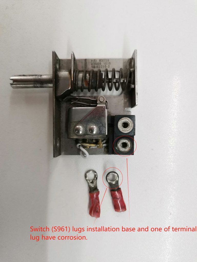故障排除措施:3次间歇性故障。11次故障中有10次找不到原因。9次更换开关。那些飞机接线和拆除的开关电阻测量正常。1次发现开关接线片安装底座和一个端子接线片严重腐蚀,可能是故障原因(请参阅附件)。