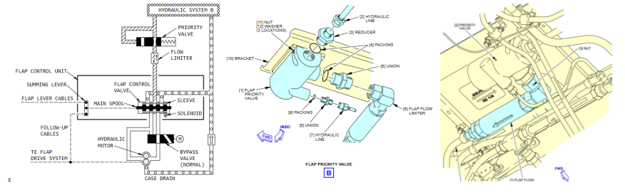 后缘襟翼系统正常由B系统驱动,驾驶舱手柄作动钢索到轮舱上部的扇形盘然后输入机械信号襟翼控制组件里面的后缘襟翼控制活门。当放出襟翼时,液压油经过前缘优先活门和流量限制器供油给襟翼控制活门控制液压马达放出襟翼。优先活门安装在轮舱顶部,限流器上游,当B系统压力低于2400PSI时,优先活门内部的滑阀作动,限制供到下游的液压油量到0.7加仑/分,以保证前缘优先放出。流量限制器位于主轮舱顶部,用于限制液压油量到14加仑/分来减缓后缘襟翼的放出速度。