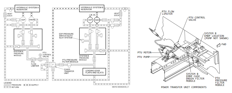 PTU是一个动力转换组件,用于当B系统发动机驱动液压泵不工作时提供额外的液压油,来使自动缝翼、前缘襟翼和缝翼以正常的速率工作。PTU使用A系统压力来为液压驱动泵提供动力,再由该泵给B系统液压油增压。PTU流量限制器位于主轮轮前壁板PTU控制活门的上游,用于限制来A自系统的液压油流过PTU控制活门,液压油流量限制为13.7 加仑/分,以保证各系统能够正常工作。活门组件件号65C26839-29(活门本体1121S1-12-14-0),该阀是一种压力补偿调节装置,控制在预定值3000PSI液压系统中的流体流量。通过阀门的流量在规定范围内保持恒定。