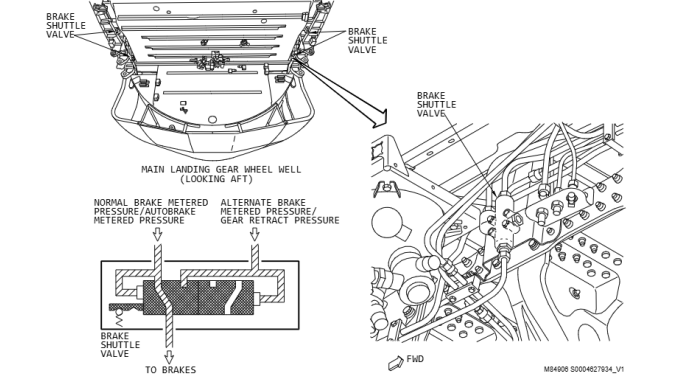 刹车往复活门位于主轮舱左右两侧,总共4个活门。主要作用是选择正常刹车(B系统液压)或备用刹车(A系统液压)中的较高压力,并将其传递到刹车组件。当两个输入压力源(如B系统和A系统)之间的压差大于80psi时,往复活门内部的滑块移动,将高压侧的压力通道打开,同时关闭低压侧通道,实现压力的定向传输。