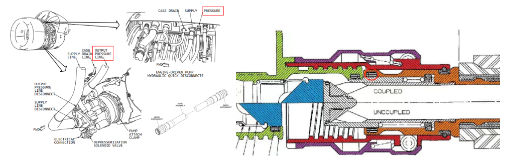 EDP供压管安装在发动机上,属于EDP液压动力输出管路,其一端通过转接头连接在EDP上,另外一端通过转接头和发动机吊架液压管连接,将经EDP增压的液压动力通过供压管输出到飞机的各液压系统。EDP供压管的两头各有一个快卸接头,可以实现管路快速断开和自封的功能,并提供接头完全连接位置的指示。EDP管路两端的快卸接头主要通过下图中的O型封圈和支撑环进行密封,防止油液外漏。