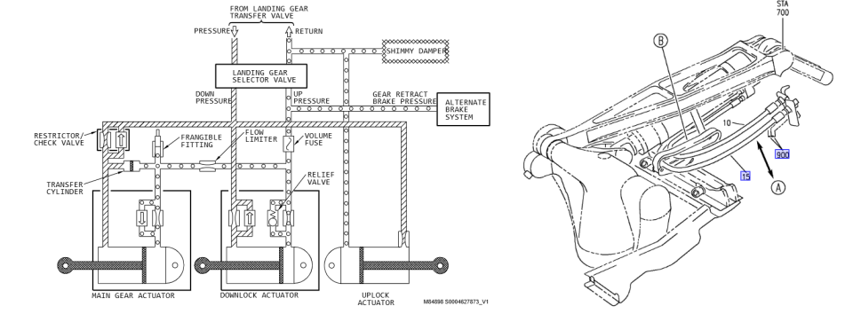起落架控制系统主要包括起落架手柄组件、起落架转换活门和起落架选择活门,收放作动筒、起落架和液压软管。当起落架手柄在收上或放下位时,液压油从转换活门和选择活门,经过收放液压软管供到收放作动筒,实现起落架收放,当手柄在OFF位时,选择活门连通供油和回油管路,收放液压软管不增压。