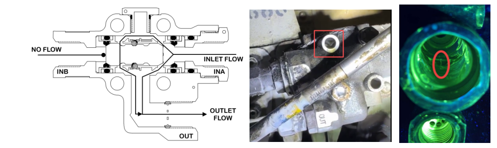 2)失效特征拆下四通组件,检查本体上的单向活门处液压油泥较多,作动活门有卡滞,无法完全复位。
