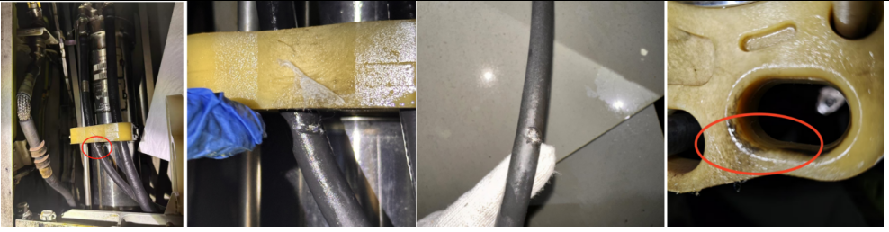 检查为右主起落架收放作动筒放下路液压软管本体漏油成线,进一步检查发现液压软管和黄色支架干涉出现磨损,拆下管路检查管路磨损处露出金属编织层,同时检查黄色支架孔干涉位置有黑色磨损印记。