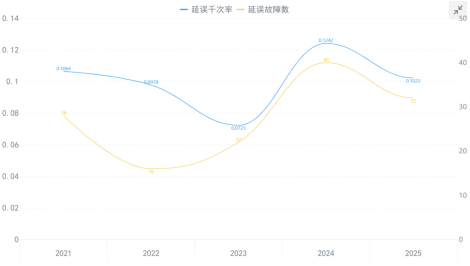 1、从近5年机队的延误千次率数据来看,整体运行平稳,存在小幅波动,但存在逐步上升的趋势。