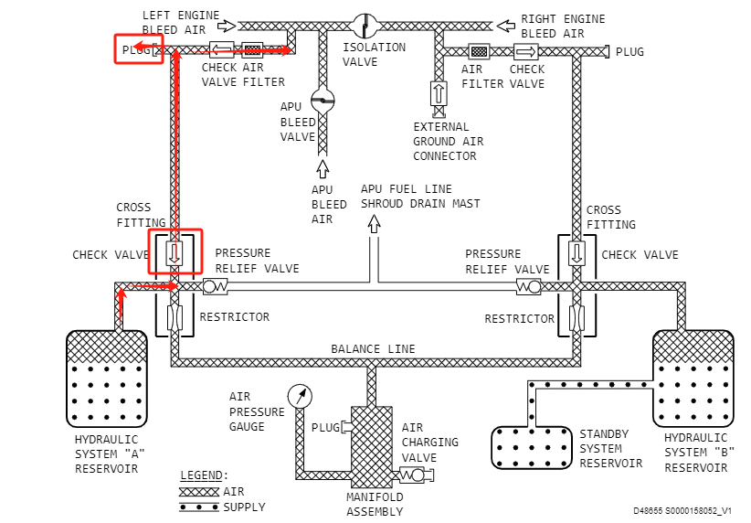 液压油箱增压系统主要由气滤组件、四通接头、释压活门、压力表等组成。在增压管路上,增压引气经气滤,气滤单向活门、四通接头单向活门进入液压油箱,两个单向活门阻止液压油箱的油气反流至空调管路。正常情况下,引气系统或外部气源给液压A、B系统油箱增压至45-50PSI,当引气系统释压时,液压油箱仍能保持增压状态。若A系统油量超过满位,在四通组件单向活门失效在开位的情况下,可能导致液压油反流到上游引气管路,从在增压气管上的PLUG堵头排出,若此时汽滤单向活门失效在开位,则油液将反流进入空调系统。