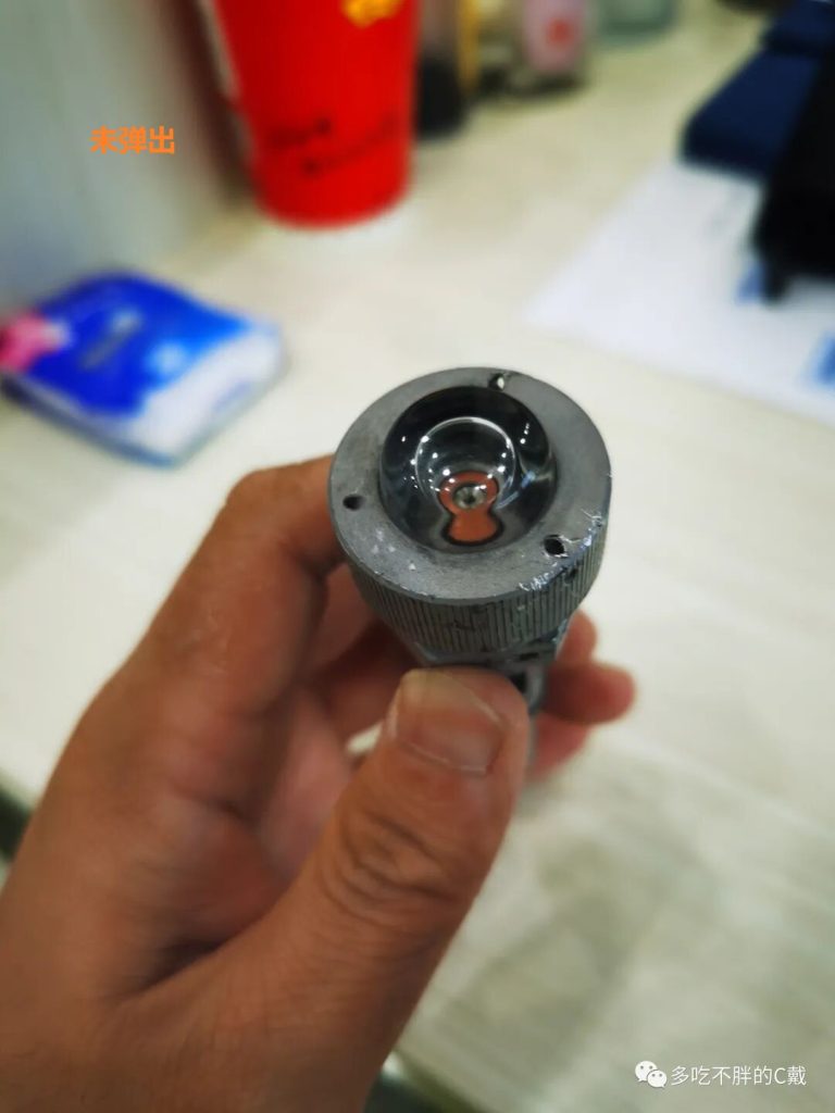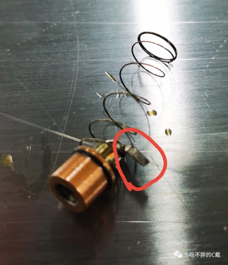 拆下的两个指示器内的双金属片,一个出现了断裂,如下图,双金属片残骸被磁性吸附在弹出指示上。