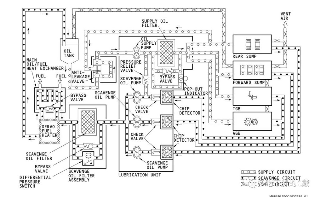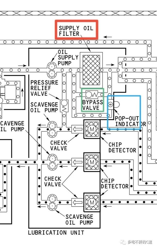 如下油路图所示,供油泵提供滑油经供油滤的过滤,然后送到需要润滑的各个部件。如果供油泵发生磨损或者滑油发生变质,碎屑或者变质的滑油堵塞了供油滤,下游部件可能因为得不到润滑而直接导致空停。因此厂家设计了旁通活门,当供油滤上下游压力差达到一定值时,活门打开,滑油不经过油滤,而直接流向下游保证发动机基本运转。
