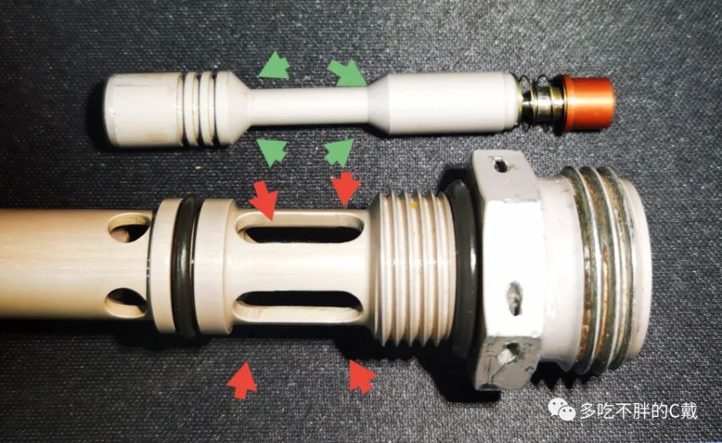 弹出指示器的整个作动原理基本如下图,红色剪头指示滑油从长条孔进入壳体,当压力上升时滑油压力如绿色剪头指示方向作用于旁通阀阀芯的两个肩膀凸台。凸台的面积差导致阀门阀芯顶开弹簧向左移动将滑油旁通过滑油供油滤,此时阀芯与磁性的红色指示器分离,失去磁性吸引的指示器弹出。