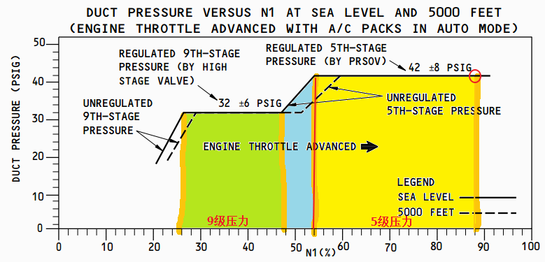海平面标准大气压情况下:N1大约25%-48%是用的9级引气,压力32+6PSI。N1大约48%-54%是5和9级压力转换。N1大约超过55%后完全使用5级引气,压力42+8PSI。