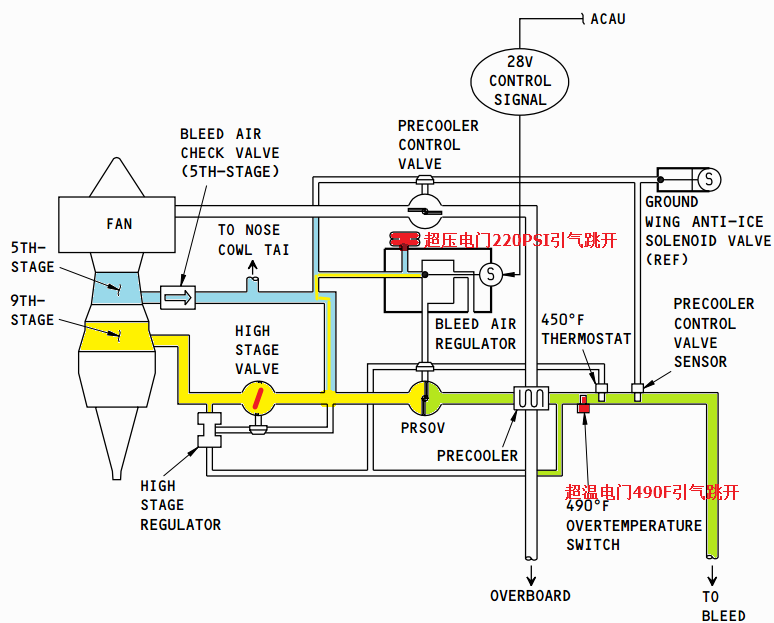 (1)超压跳开:BAR感受PRSOV上游级间压力,当压力超过220PSI时引气跳开。