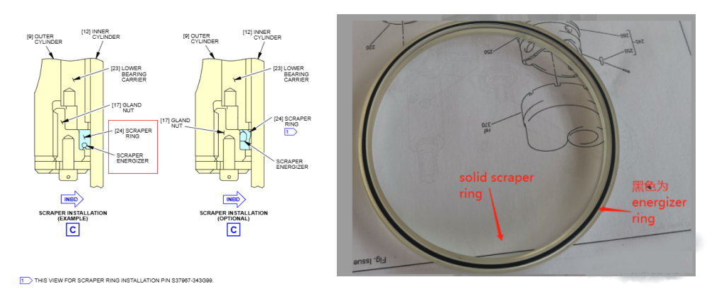 近期机队反映1起73N飞机前起落架镜面漏清油的案例,完成前起动静封严更换时,检查发现前起刮油环上的封圈(energizer ring)损坏,疑似老化碎裂,在下部轴承和INSERT之间有封严碎片残留。分析是由于封圈碎裂后,进入前起内部卡在封严处,导致密封性能下降出现漏油漏气。为机队首例,特做记录。 Post Views: 16 文章导航 井盖凸起于地面导致飞机滑不动