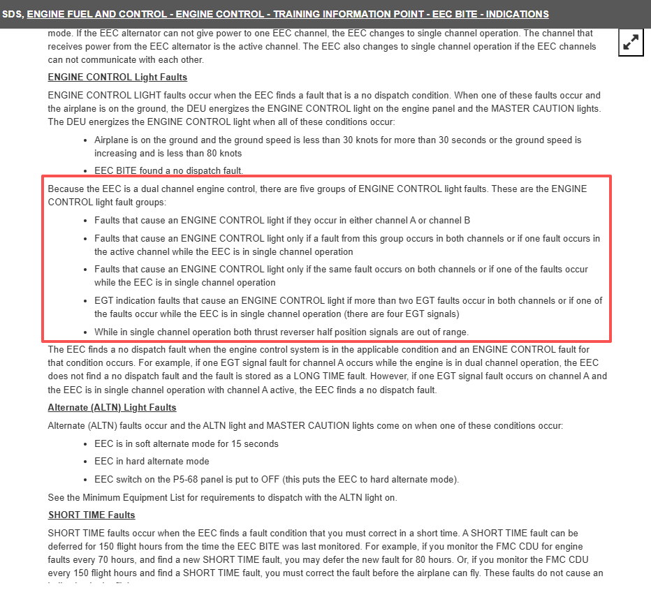 第四种情况指出,当EEC工作在单通道模式下时,单个EGT探头故障即可能导致出现控制灯亮。