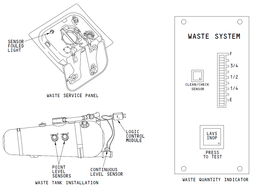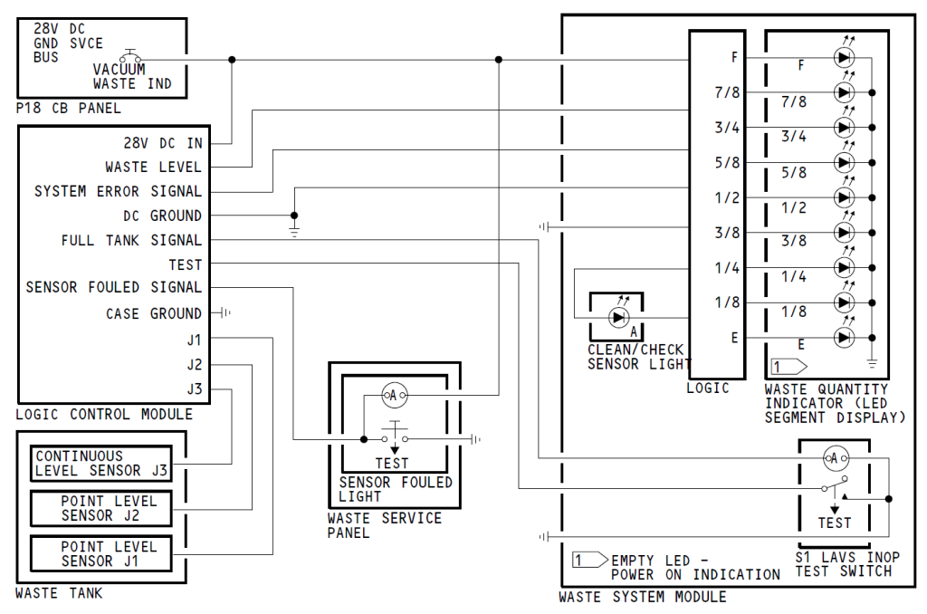 波音737NG飞机污水量指示系统如图1所示,由两个点位传感器、一个连续位传感器组件、一个逻辑控制组件(LCM)以及污水量指示器四部分组成。