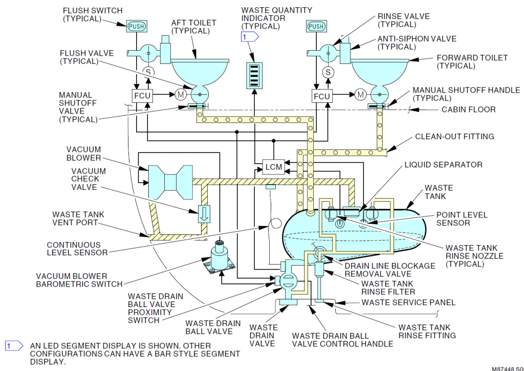 点水位传感器是电容式传感器,起到“电门”式作用。一旦传感器脏了,就会向逻辑控制组件LCM发出信号,LCM上相关的传感器灯J1或J2闪亮,同时后乘务员面板上CLEAN/CHECK SENSOR灯亮。当两个点水位触感器都感受到“满位”时,或一个出现故障而另一个感受到“满位”时,就会向LCM发出信号,同时点亮后乘务员面板上LAVS INOP指示灯,此时厕所冲洗系统将无法工作。