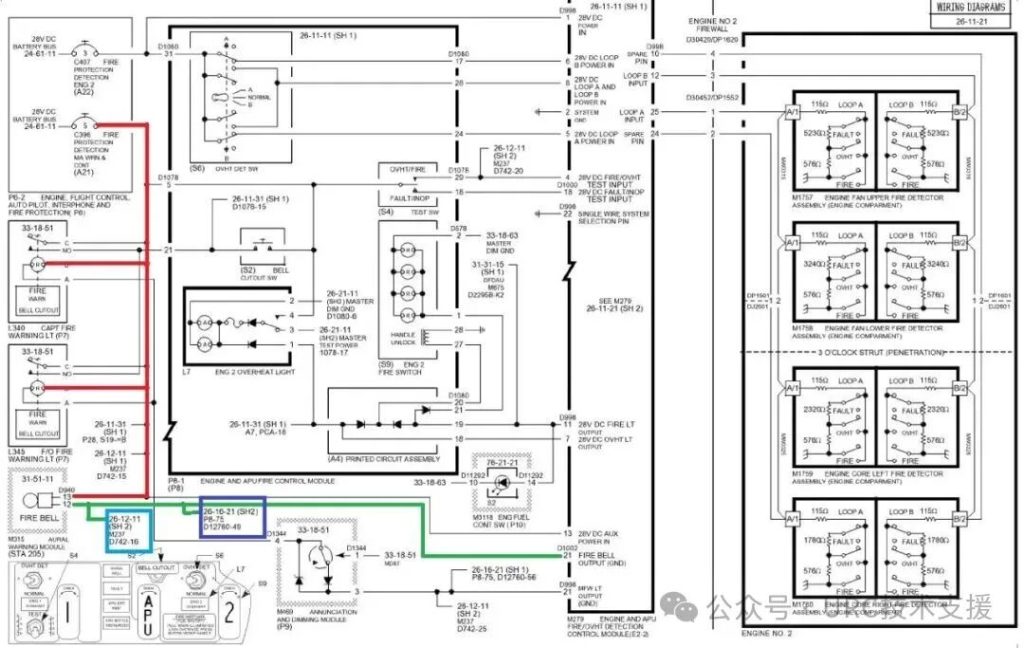 有737NG飞机反复间隙性反应,空中、起飞、滑跑和落地时,火警警铃都间断性响,无灯光指示,警铃比正常铃声弱。基本判断为线路问题导致的间歇性故障。