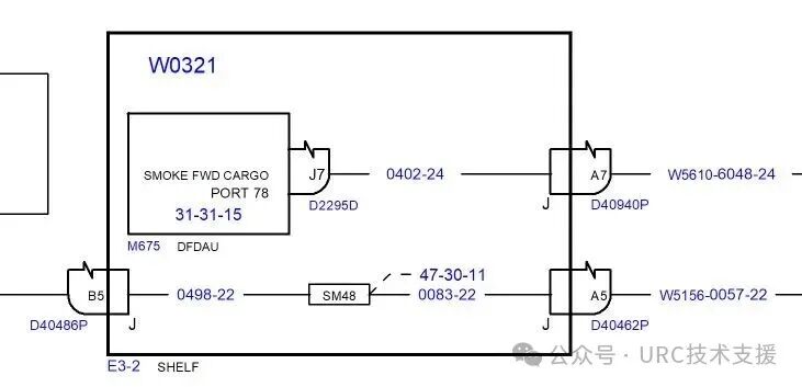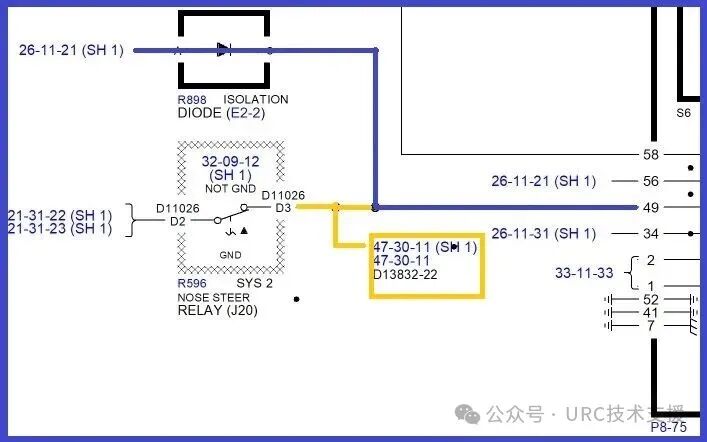 但检查后未发现异常,此时发现从M315火警铃D940的PIN12下游不仅连接P8-75面板,继续往下游连接R596和M2559 NGS控制器,R596继电器下游为二极管,电路不通,此时排故已经走到线路末端了,需要详细从以上三条线路出发,逐段隔离。