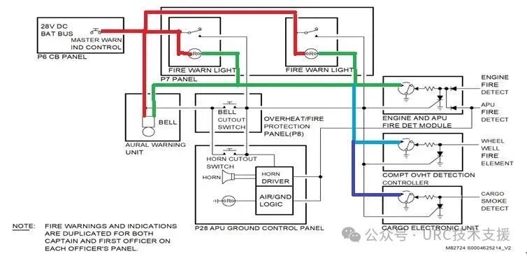 当探测到以上任一火警时,P7板两个FIRA WARN红灯会点亮,火警铃会响起;当APU火警时右轮舱火警铃及火警灯会交替工作,若飞机在空中出现APU火警,此铃声会被切断。