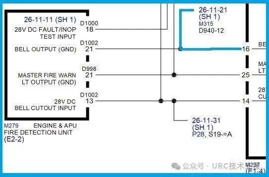 由原理图初步判断,若M315火警警铃D940插头内P12号钉及后续线路出现接地,会导致本次故障现象,可能的线路: