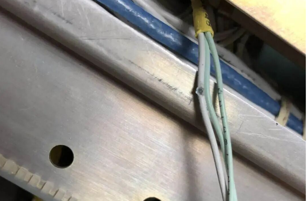 最终在线路排查中,发现SM48 处有一线路(W0321-0499-20的这根白线)与支架接触磨损,模拟可以再现故障,修复后故障正常。