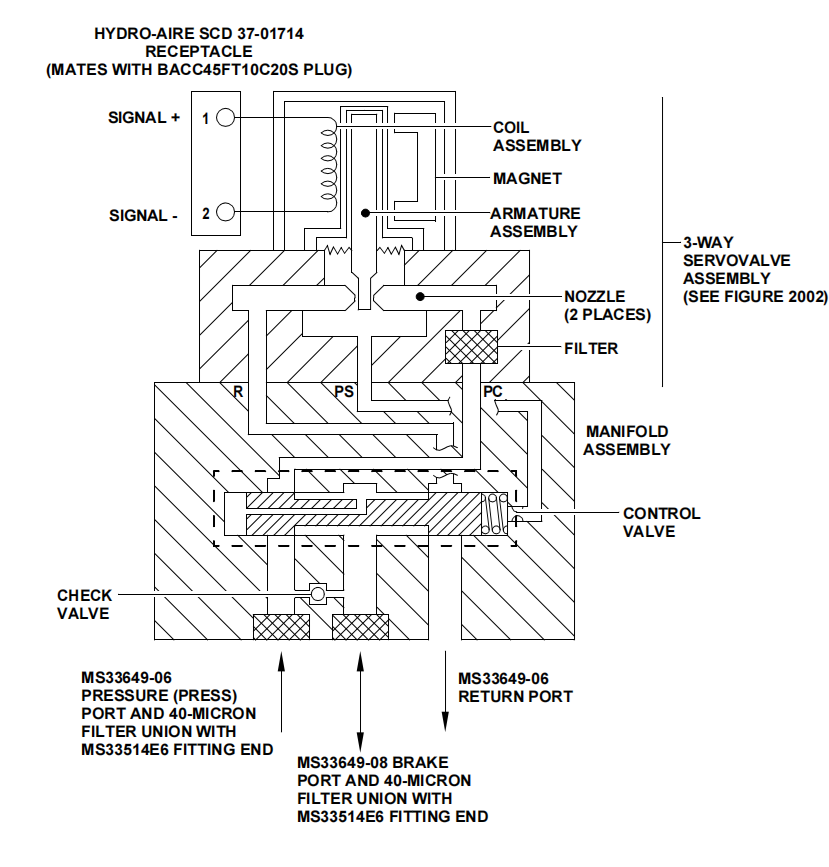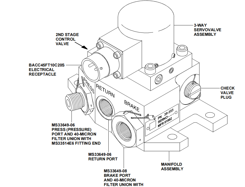 其中防滞活门的主要结构,包括:第一级伺服阀、第二级控制活门和三通伺服组件,控制阀组件是一个两阶段压力控制阀,根据控制器伺服阀电流指令调节计量的液压压力,以防止车轮抱死或偏航。 三通伺服阀组件向第二阶段控制阀提供控制(先导)压力。控制压力与控制器施加到扭矩电机的输入电流指令成比例。通过拆下盖板可以接触到调整螺钉,用于设定施加的控制压力与电流指令之间的关系。