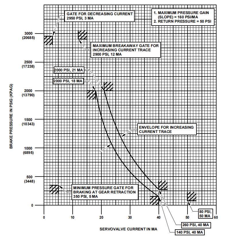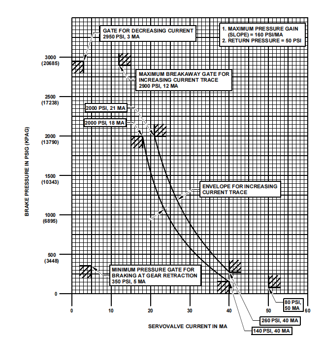 | 5 | 运行 三个完整周期 的BRAKE端口压力与阀驱动电流关系曲线。将第三个周期绘制在X-Y记录仪上,并评估曲线 | 合格标准 滞后带宽 上升和下降曲线之间的滞后带宽不得超过1.2 mA(在200至2800 psig,即1379至19306 kPag范围内) 上升曲线 必须位于图1002所示的最小和最大限值以内,且在80 psig(552 kPag)处低于50 mA门限 曲线平滑度 电流-压力曲线必须平滑且连续,不得有突变 曲线斜率 曲线的斜率不得超过160 psi/mA(1103 kPa/mA),范围超过100 psi(6900 kPa)时。若在小于100 psi范围内出现斜率大于160 psi/mA的突变点,可接受 |