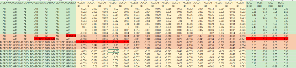2、2020年3月25日,B-20*F飞机右外主轮中心毂被环切,译码数据回溯发现,前段Single Crab Landing ,滚转角2.6(ROLL顺时针),横向载荷-0.477,垂直过载1.43。
